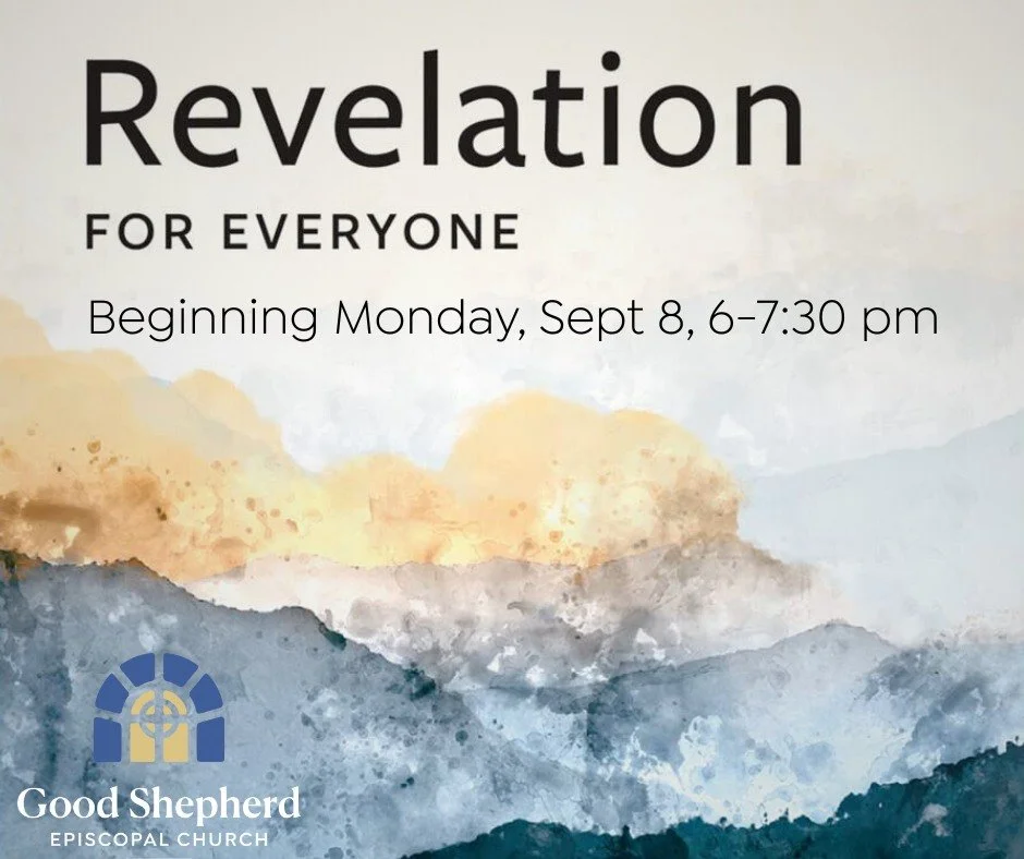 Revelation Study Monday, September 8, 2025 6:00 PM Tuesday, November 11, 2025 7:00 PM Good Shepherd Episcopal Church 1207 Winding Way Drive Friendswood, TX, 77546 United States (map) Google Calendar ICS "Revelation Study" -- Work your way together through the Book of Revelation with guidance from N.T. Wright's "Revelation For Everyone". Begins September 8th on Monday evenings at 6 pm. Co-led by Alice Purcell and Leah Jones.